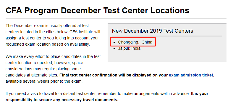 但是需要注意的是,所有CFA®考试的考点座位是有限的,如果有想要更改2019年12月CFA®考试考点的同学要抓紧。因为CFA®协会规定,如果考点座位不足的话,要求在同一城域范围内的考点将不被接受,CFA®协会会让你的考试地址接近你要求的考点。