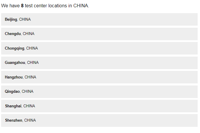 中国大陆地区考点城市8个: 北京、成都、广州、杭州、青岛、上海、深圳、重庆(新增)