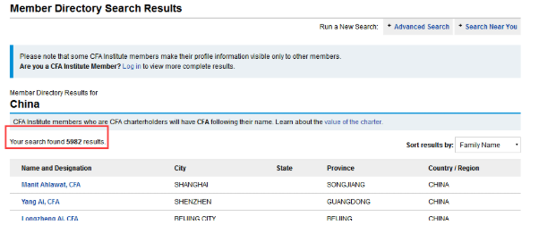 于是,学姐便在官网找到了协会的CFA持证人花名册,并锁定中国,进行搜索。