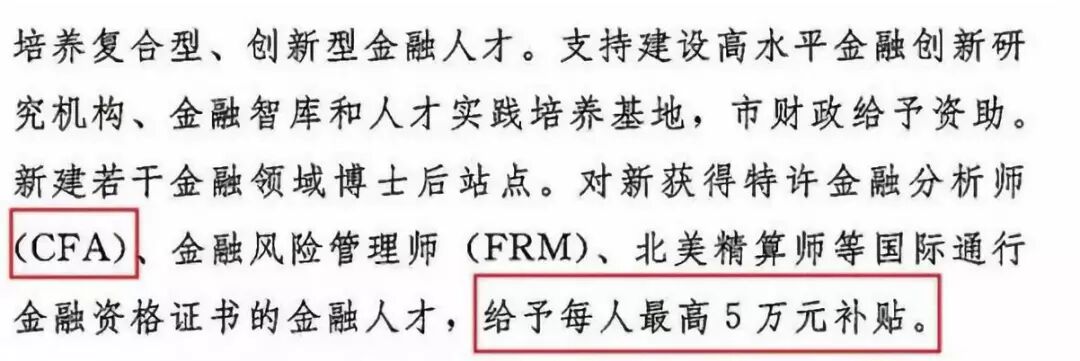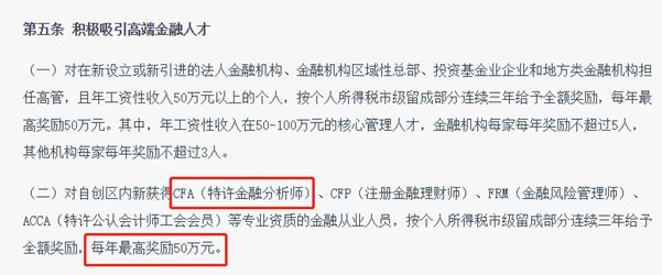 此外,在《关于实施“鹏城英才计划”的意见》里指出,对于CFA持证人直接给予最高5万的现金奖励。