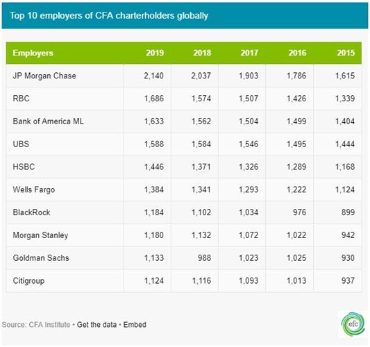 其中摩根大通2019年再次成为全球最大的CFA雇主,雇佣CFA持证人高达2140人!