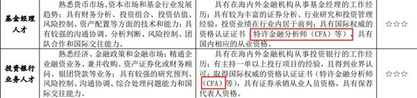 在这个《目录》中,我们可以频频看到CFA这个关键词!比如“基金经理人才”和“投资银行业务人才”,都要求拥有CFA证书。