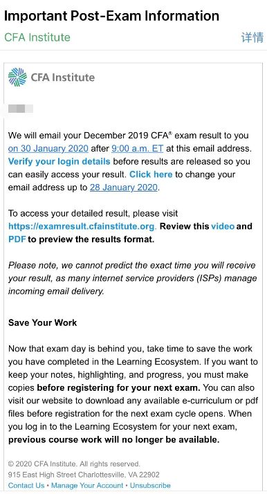 很多宝贝们在昨晚就收到了CFA协会发来的邮件,邮件提醒大家出成绩邮件将于1月30日收到CFA成绩。根据时差,大概在悉尼时间晚上1点(北京时间10点)便可陆续接到CFA协会发来的成绩邮件哦。如果您需要修改接收邮件地址需要1月28前点击您邮件中Click here直接去修改,但是小愚学姐建议大家除非您的邮件无法接受正常邮件的情况下才去修改。真心祝福大家都pass