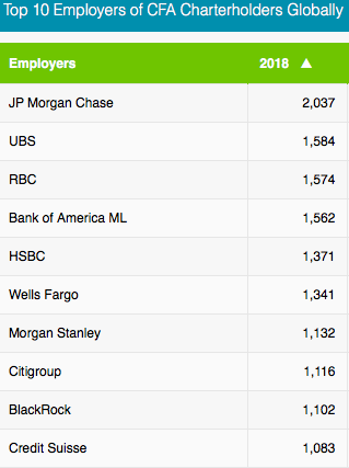 大型银行 (包括投资银行)、证券公司、会计师事务所和咨询公司是CFA持证人最多的就业选择。看看以下这些响当当的名字吧: