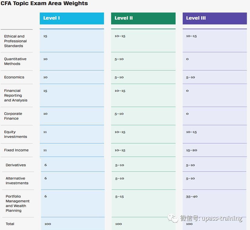 可能大家都知道,CFA总体来说分为10个科目,在每个级别中的比重不同。