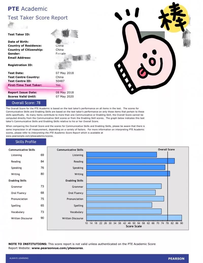 最后说一下听力,是四部分中成绩最低的,好玩的是我雅思成绩中听力8分是最好的部分。当然这充分说明了PTE最难的部分就是听力,比起雅思的听力难出一大截,所以如果雅思听力较差的同学一定要多练习这个部分。