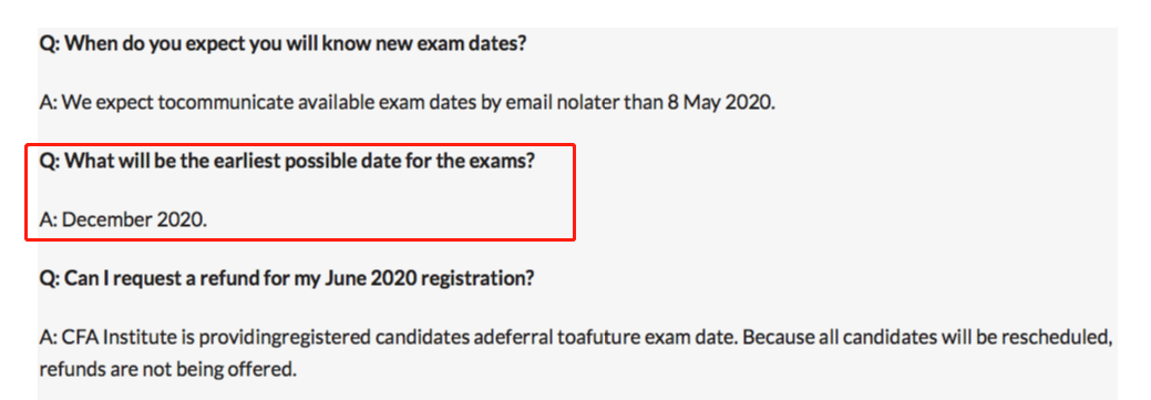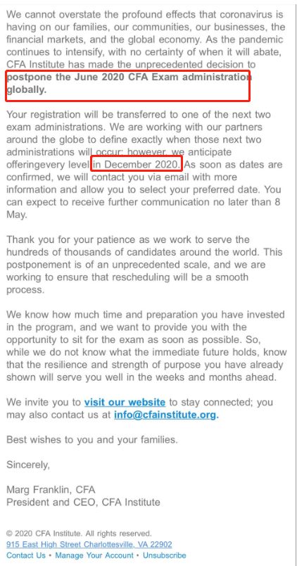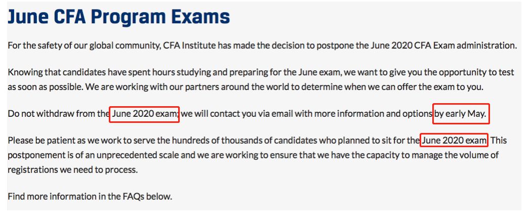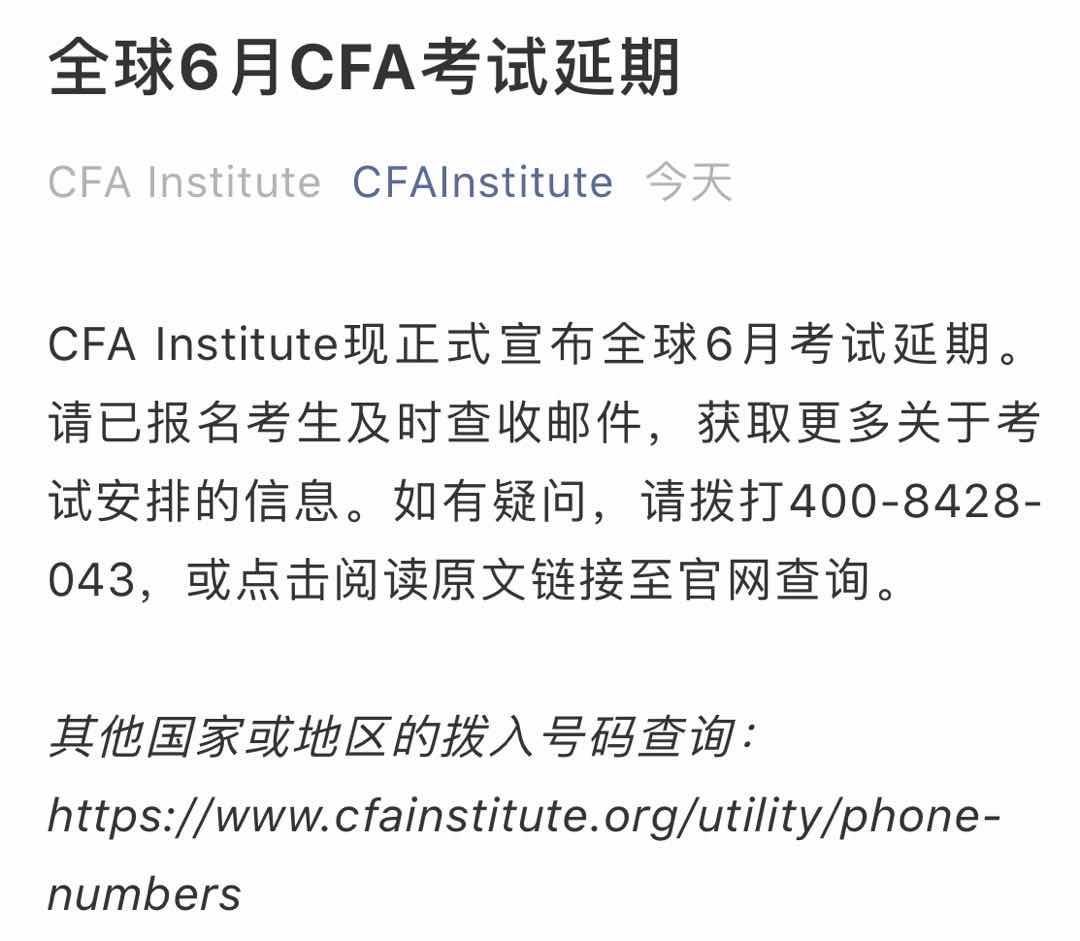 报名了6月CFA考试的考生,无论是一级、二级或三级,都会被延期到最近的两场考试。而这两场考试,具体的日期没有给出。