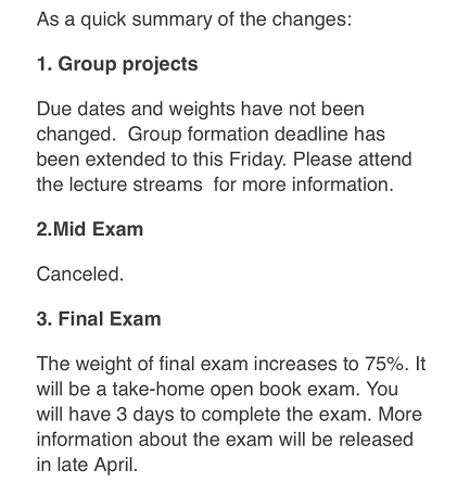 以上项目均在线上完成,期末考是线上开卷考的形式,除此之外,学生有三天的时间来完成这个期末考。