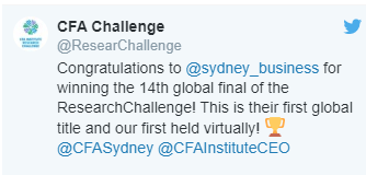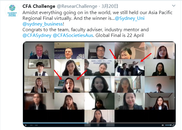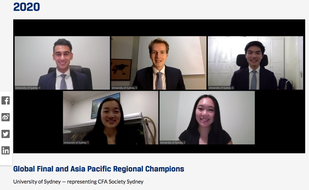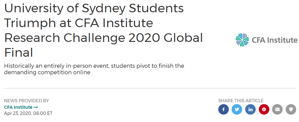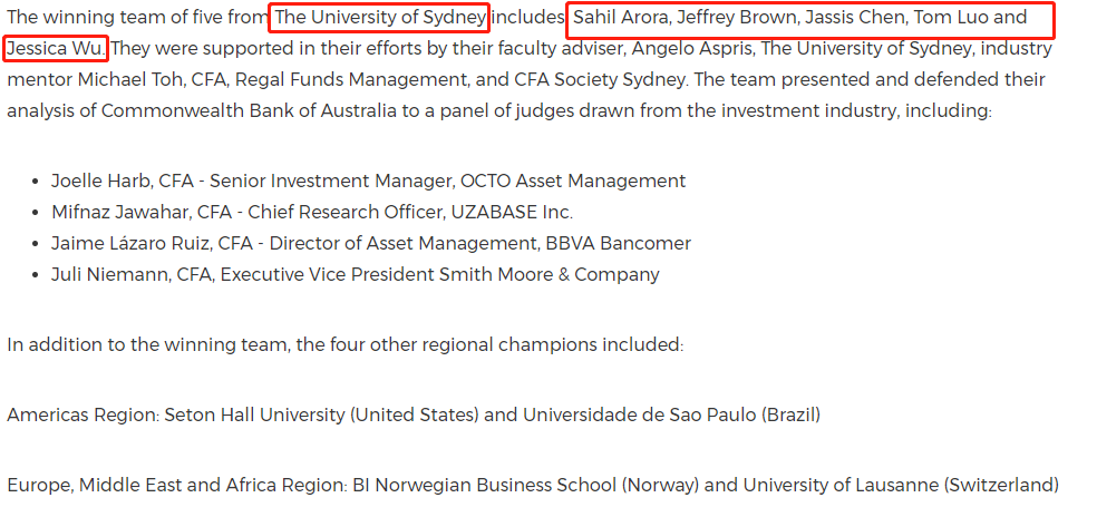 首先学姐这里恭喜我们悉尼大学的学生团队荣获第十四届「CFA Institute Research Challenge 」总冠军.这项荣誉首次被澳大利亚悉尼大学获得!恭喜!恭喜University of sydney 这几位学生。你们是我们的骄傲